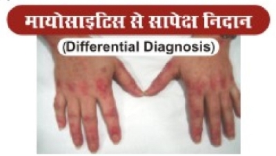 इस रोग का मायोसाइटिस (Myositis) रोग से सापेक्ष निदान (Differential Diagnosis) किया जाता है। जबकि मायोसाइटिस में मांसपेशियां धीरे-धीरे कमजोर होती जाती है। पालथी मारकर बैठने के बाद उठने में अगर सहारे की जरूरत पड़ने लगे तो समझना चाहिए कि मासंपेशियां कमजोर होनी शुरू हो गई है। इसमें हाथों-पैरों की डिस्टेंट मसल्स (दूर की मसल्स जैसे पंजे, उंगलियां) की अपेक्षा जांघों, कूल्हों, कंधों,हाथों की प्रॉक्सीमल मसल्स यानी कि इन अंगों के नजदीक की मसल्स (जैसे कंधे और हाथ के जोड़ के पास की मसल्स, जांघो और पैर के जोड़ की मसल्स) ज्यादा प्रभावित होती है। गले की मांसपेशियों में दर्द